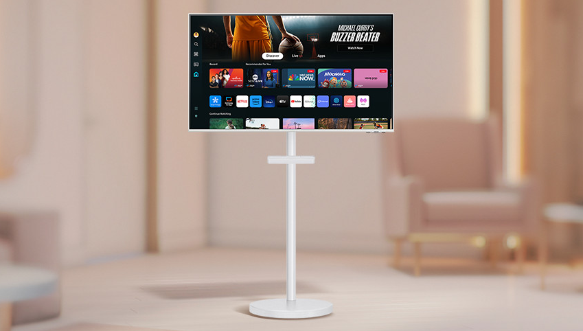 별도로 판매되는 이동식 거치대(스탠드)를 결합하면 거실, 침실, 주방을 자유롭게 이동하며 사용하는 나만의 이동식 스마트 TV가 완성됩니다.